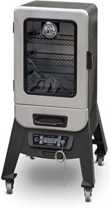 Sturdy and water-proof, the Charbroil Analog can smoke all your favorite proteins. While, design features like dual exhaust port, double-wall construction, and dual door latch seal in smoke and heat. It’s easy to use and packs plenty of heating power and cooking space. Though heavy for its size, this analog smoker is great for no-frills, hassle-free backyard barbecue smoking.